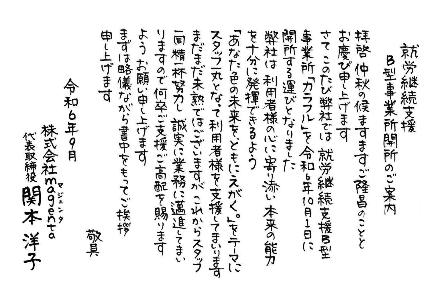さてこのたび弊社では就労継続支援B型事業所「カラフル」を令和6年10月1日に開所する運びとなりました